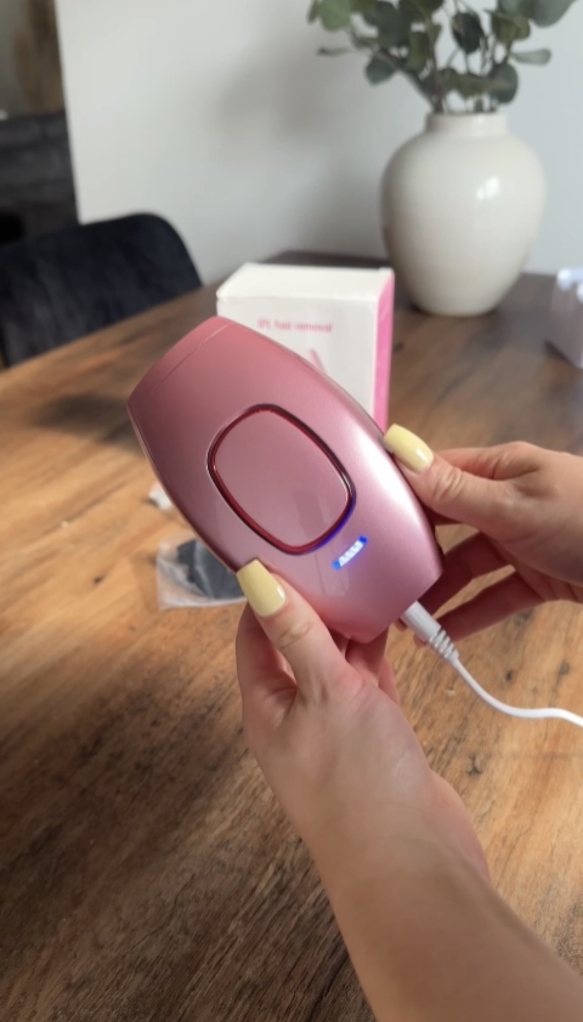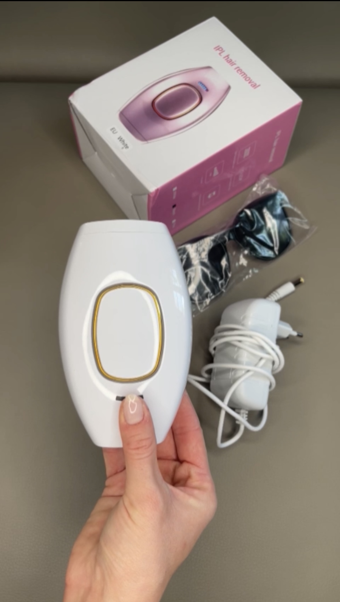 Packe alles aus und stecke das Stromabel in den IPL Hair Remover und den Stecker in die Steckdose.